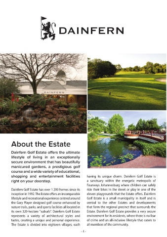 its own 320-hectare "suburb". Dainfern Golf Estate Estate. Dainfern Golf Estate provides a very secure